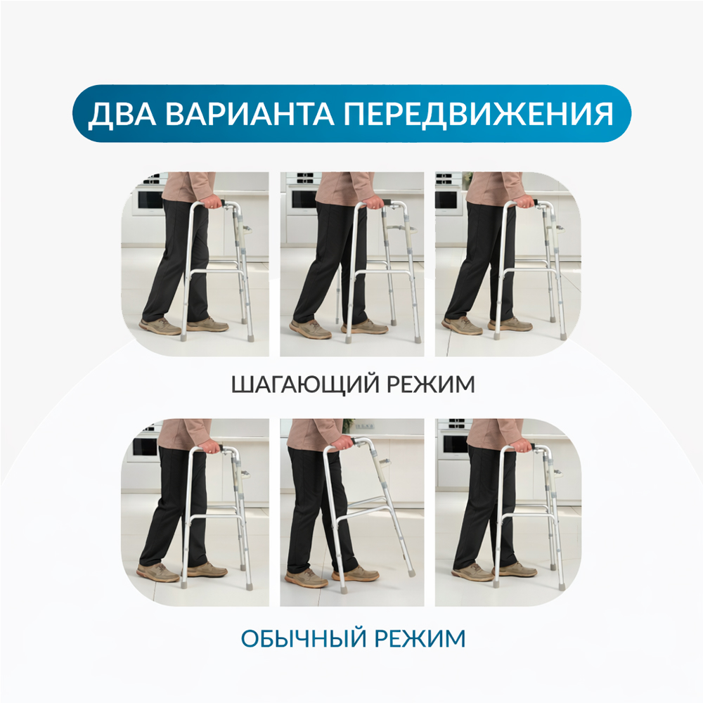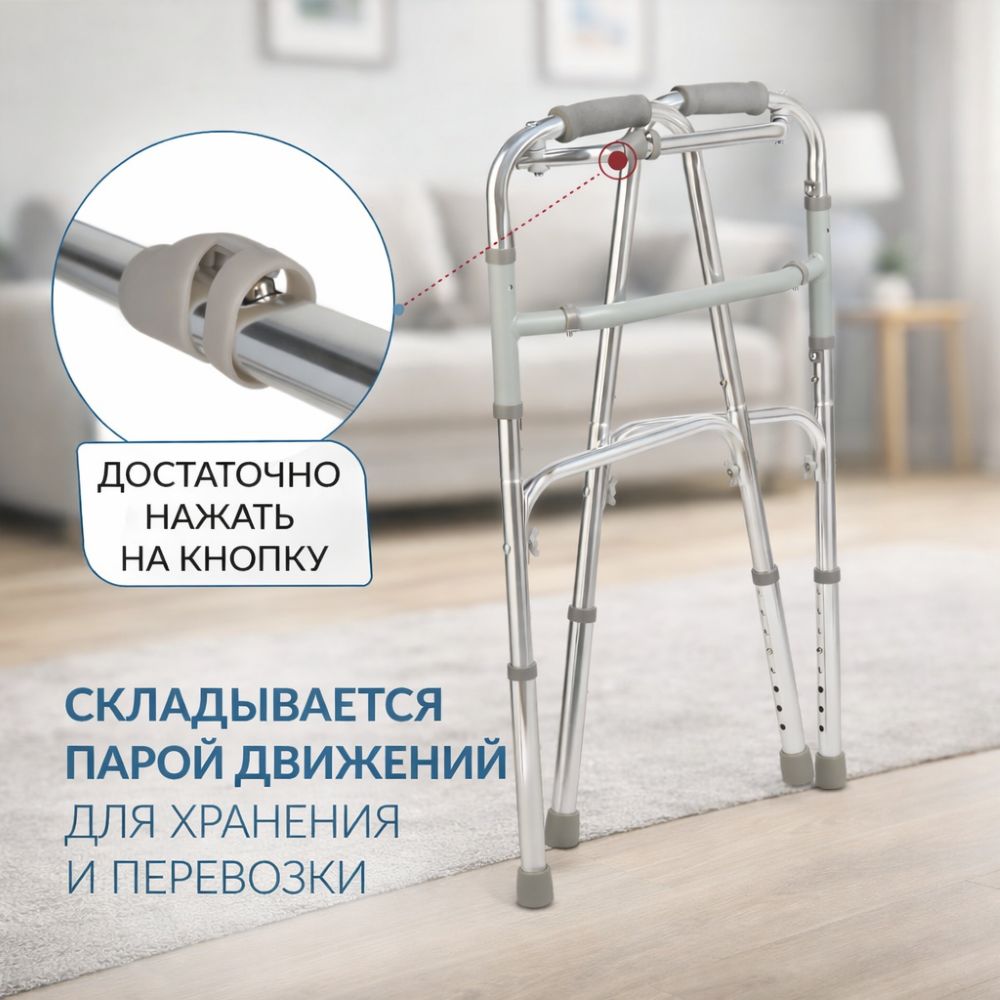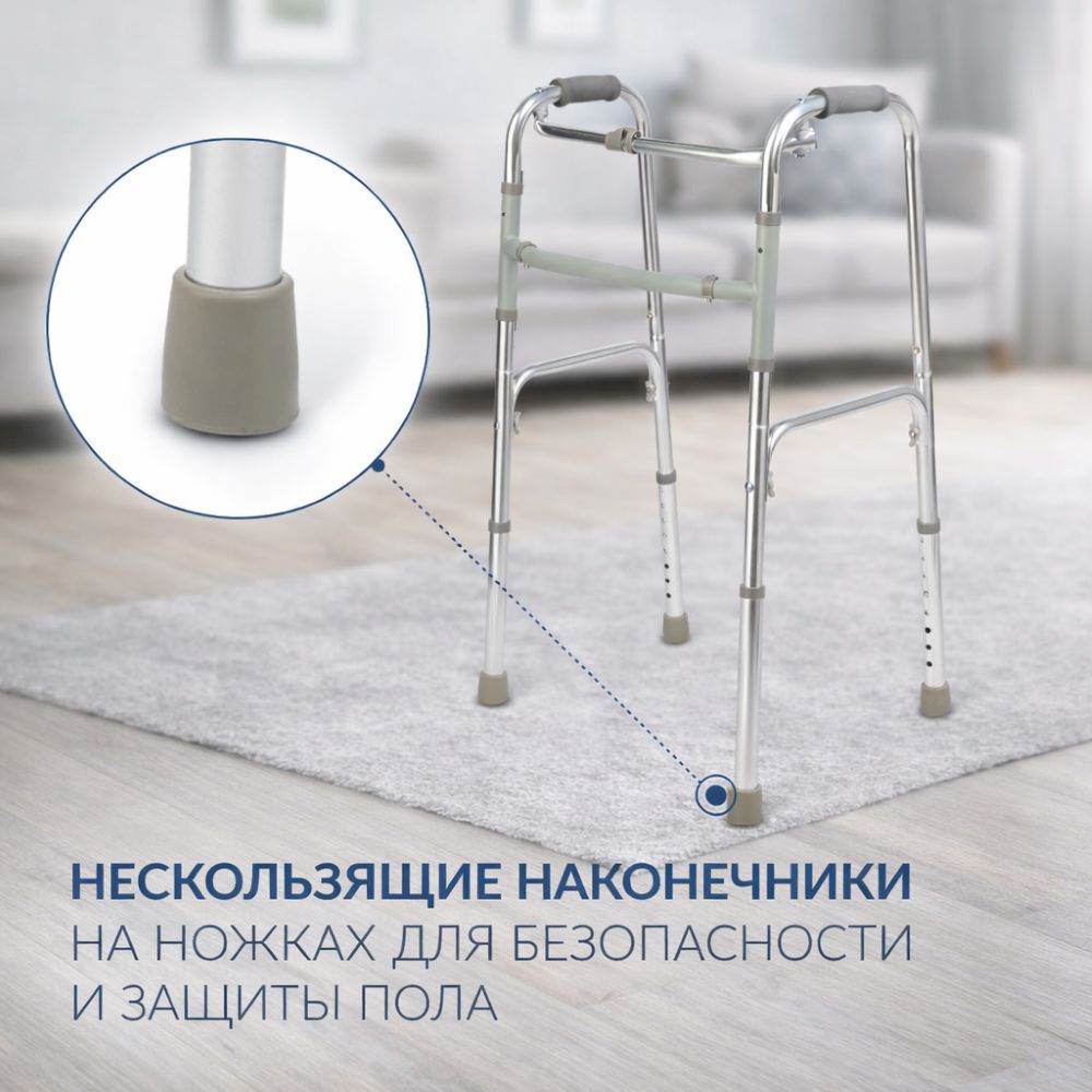 • Регулируемая высота позволяет настроить ходунки под индивидуальный рост пользователя, обеспечивая оптимальное положение тела и комфортные условия для передвижения;